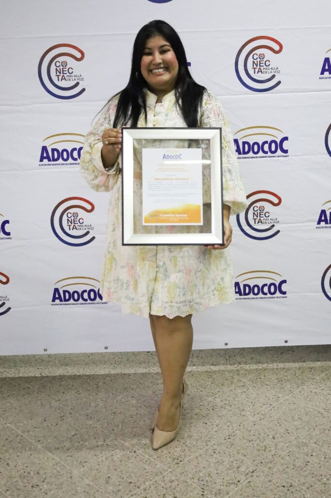 Santiago de los Caballeros, República Dominicana. — La periodista Milagros Méndez fue reconocida por la filial Santiago de la Asociación Dominicana de Comunicadores Cristianos (ADOCOC), en mérito a su destacada trayectoria profesional, compromiso ético y valioso aporte a la comunicación en la región.